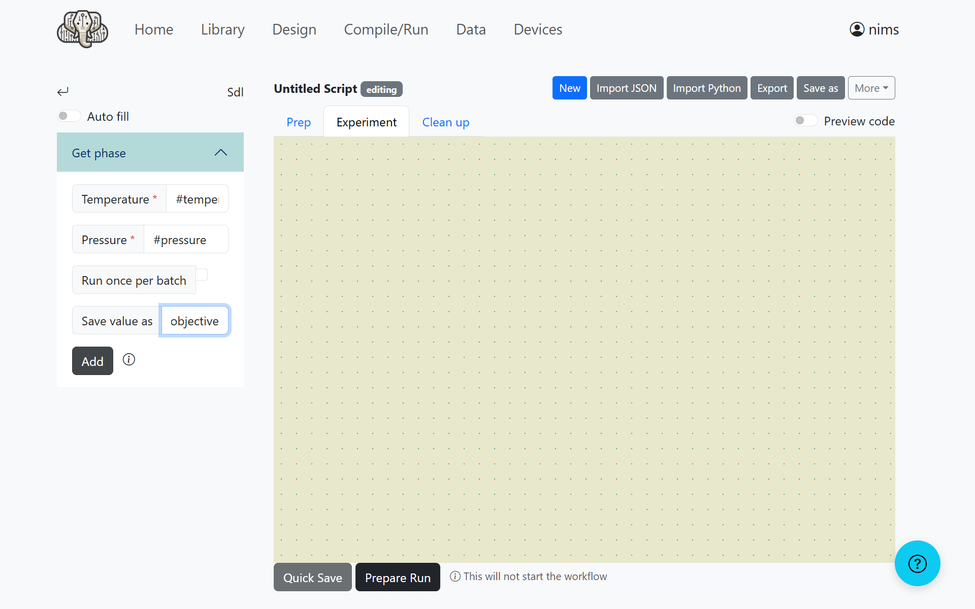 When you have finished designing the workflow, click the Prepare Run button to open the experiment plan settings screen.
