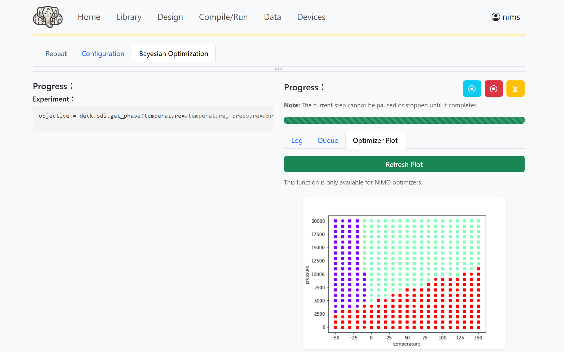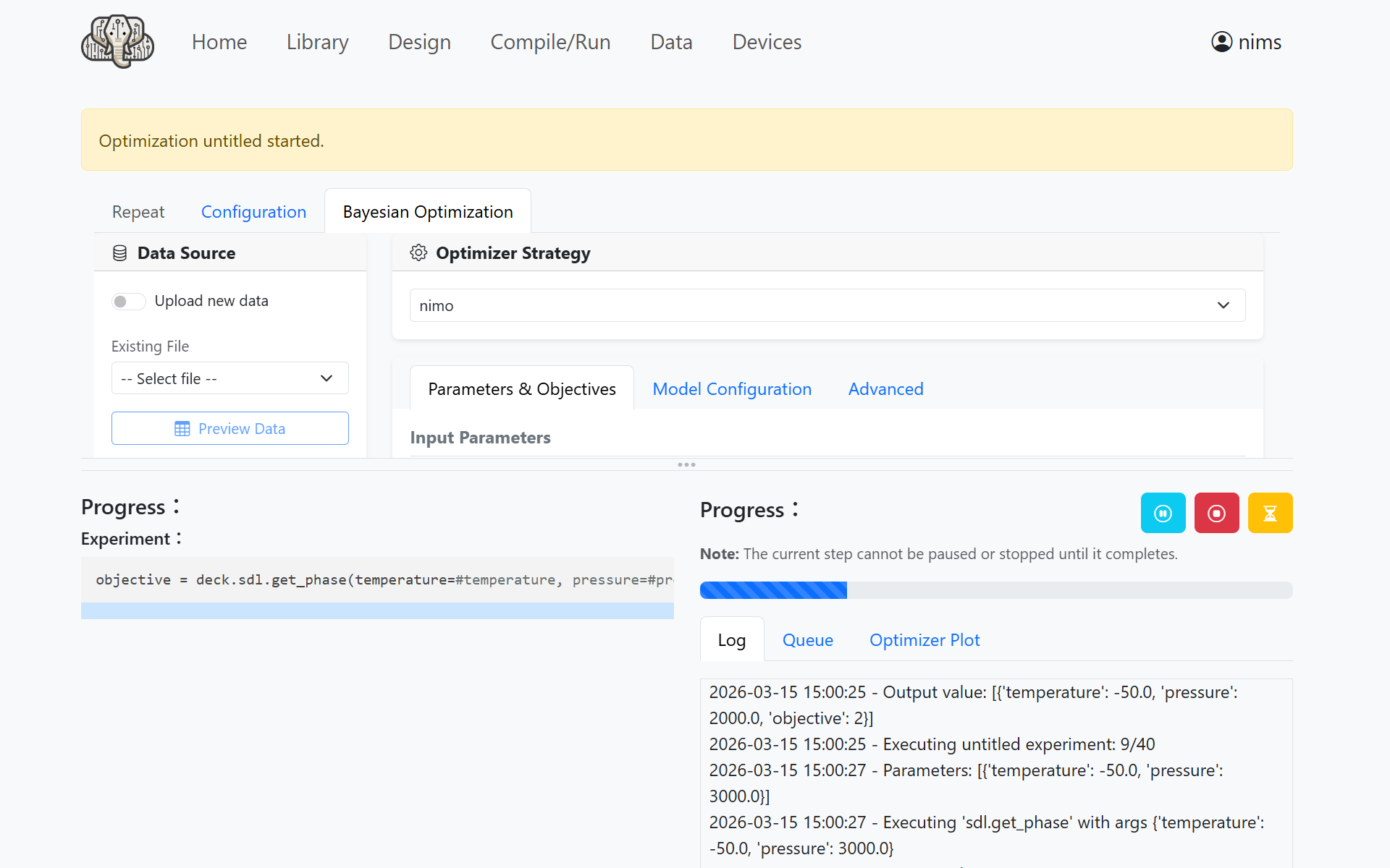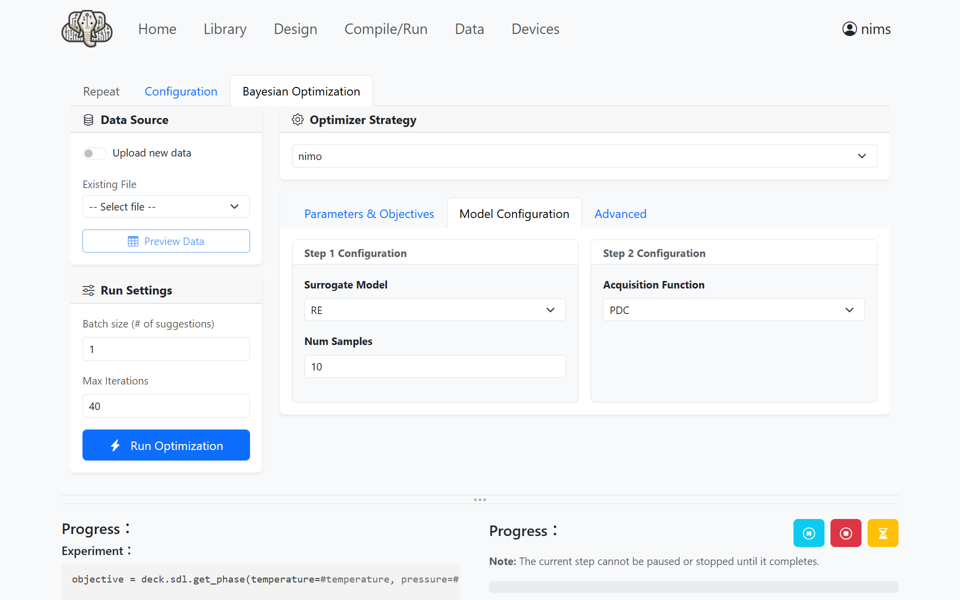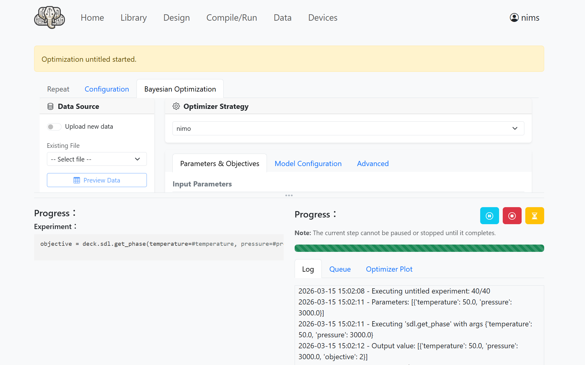Click the Run Optimization button to start the experiment with NIMO.